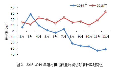 2019年,建材机械行业累计实现利润总额36.57亿元,同比下降31.00%,增速较上年同期回落64.26个百分点,落后于建材工业(15.6%)、机械工业(-4.53%)的增速,远低于建材机械相关领域工程机械(16.48%)、重型矿山机械(21.65%)增速。从增速变化趋势看(见图2),全年利润总额增速下行态势明显,且与上年相比回落较大,降幅最高达64.26个百分点。