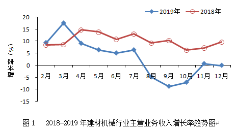 据国家统计局统计数据显示,2019年全国建材机械行业规模以上企业478家,累计实现主营业务收入657.43亿元,同比下降0.01%,增速较上年同期回落9.61个百分点,低于建材工业(11.5%)、机械工业(2.46%)的增长水平,且落后于建材机械相关领域工程机械(10.94%)、重型矿山机械(9.32%)的增速。
