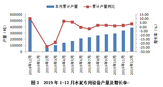 从行业重点监测的产品看,水泥专用设备产量实现小幅增长,2019年累计完成38.65万吨,同比增长3.69%,较上年同期下降6.37个百分点。从全年产量增速变化趋势看(见图3),上半年波动较大,下半年逐步趋缓、趋稳。