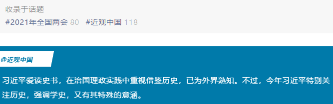 外界关注到,今年全国两会上中国最高领导人习近平在“两会团组时间”里频频讲史论史感慨今昔,透露出浓浓的历史感—— 在内蒙古代表团讲“齐心协力建包钢”“三千孤儿入内蒙”两段历史佳话,强调学习历史的重要性;参加政协委员联组会回顾过去一年惊心动魄的战疫史,感慨今昔,指出中国交出世界瞩目答卷“不仅是一时之运”;在青海代表团,回忆十多年前玉树灾后情景,赞叹今天当地发展实现“苦干三年跨越二十年”……